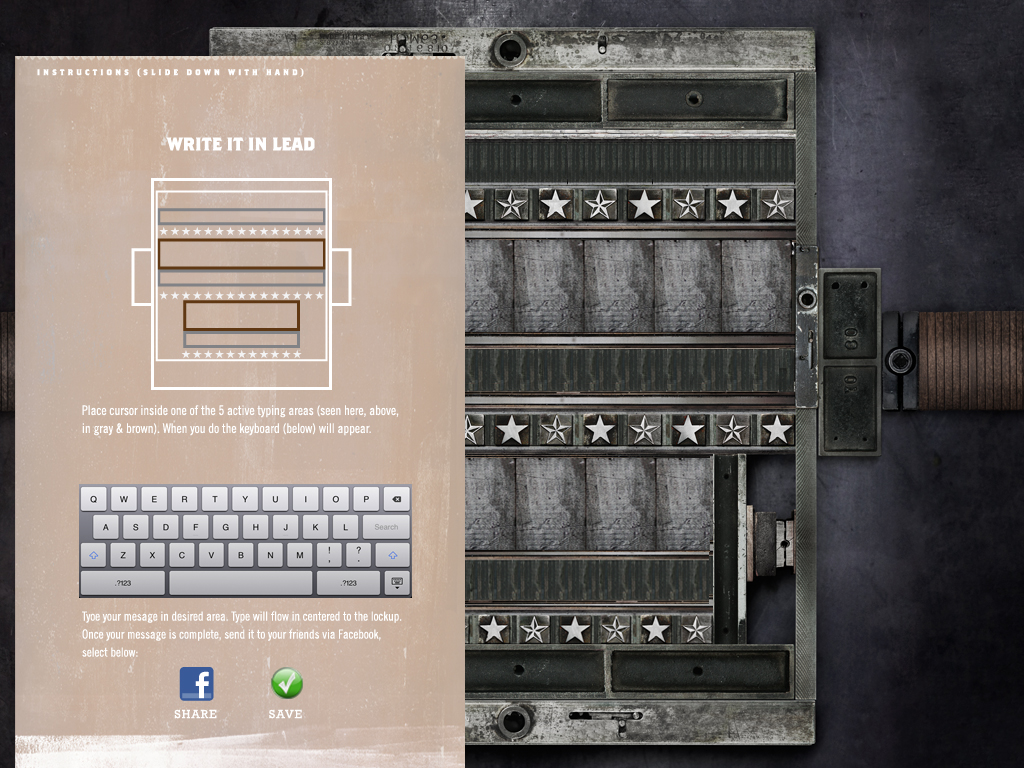 The app also featured the ability to type in lead — a letterpress feature that allowed users to type their own message in letterpress type and send jpgs to friend and social media outlets.